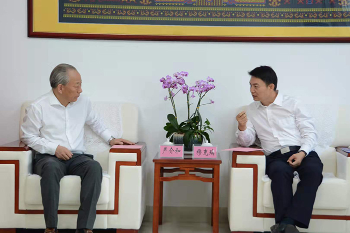 11月1日,嚴(yán)介和理事長應(yīng)邀同海南省保亭縣委書記穆克瑞會談,雙方就開展地企合作等問題進行了交流。莊嚴(yán)建設(shè)董事局主席金亮、地球村建設(shè)董事局主席胡童全程陪同。